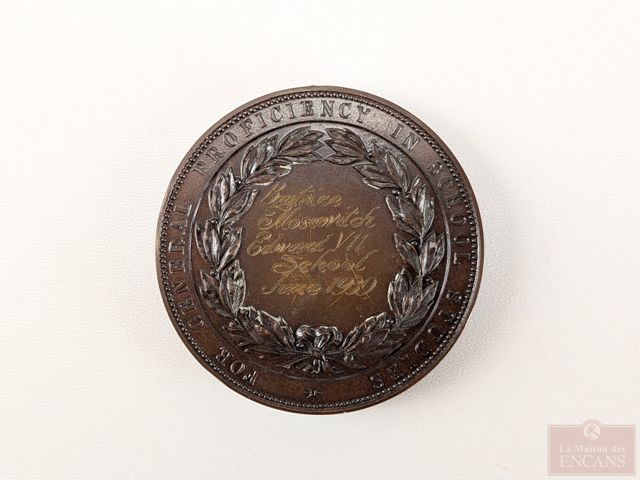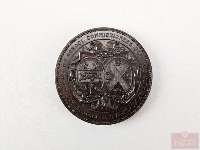 Médaille en bronze datant 1939, mesurant 2.25 pouces de diamètre, avec inscription Protestant Board of School Commissions for the City of Montreal