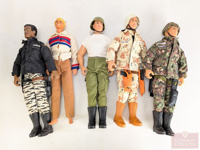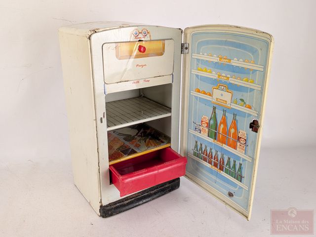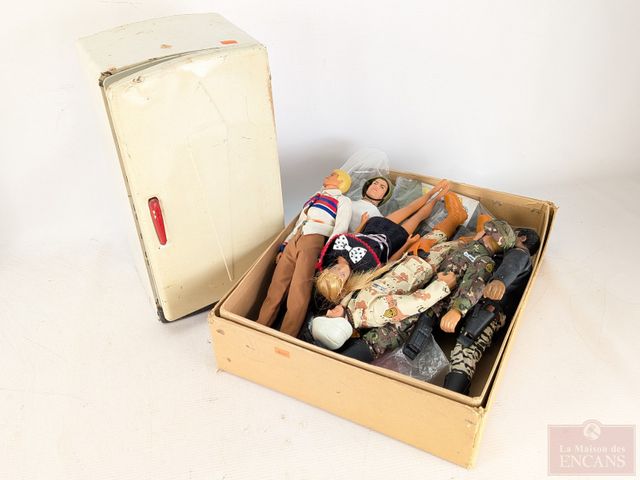 Lot de jouets vintages comprenant figurines G.I. Joe, poupées Barbie, réfrigérateur mesurant 14 pouces de hauteur et autres