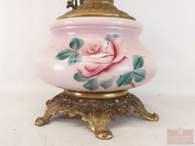 Lot # 10 - Lampe à huile en laiton avec globe en verre peint à la main faite aux États-Unis et datant du début du 20em siècle - mesurant 24 pouces de hauteur SOLD
