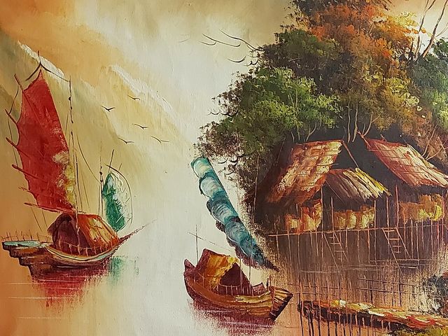 Lot # 175 - Huile sur toile chinoise représentant des jonques arrivant au village mesurant 16x29.5 pouces SOLD