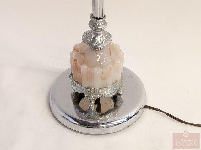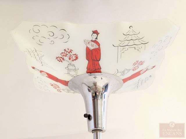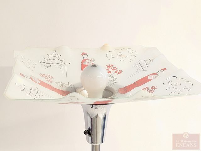 Lot # 132 - Lampe sur pied vintage en métal chromé avec abat-jour en verre à motifs orientaux, mesurant 64 pouces de hauteur SOLD