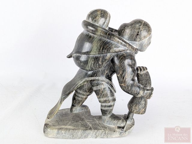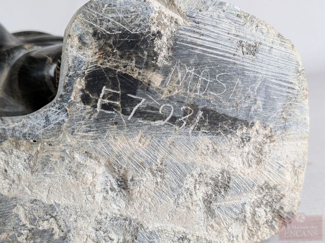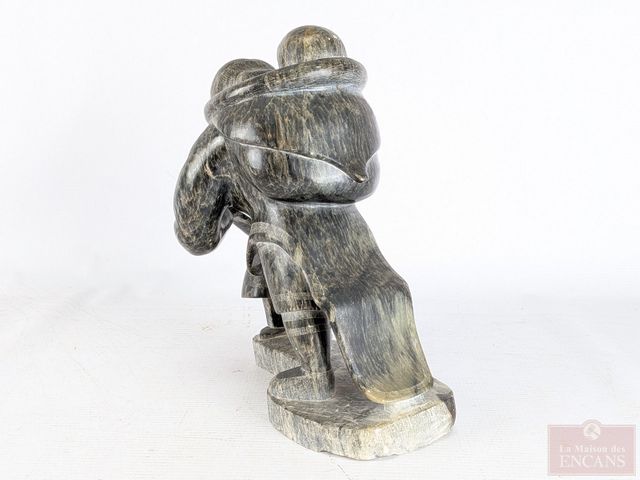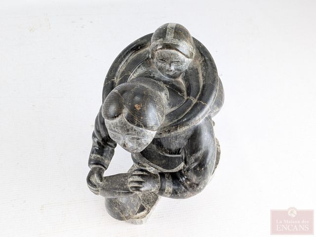 Lot # 130 - Sculpture de qualité muséale avec de nombreux détails et interstices très fins, sculptée par l'artiste inuit dans une seule pierre, représentant une femme inuite portant son enfant en confectionnant un mocassin. Sculpture en excellente condition, signée, circa 1960, mesurant 10x8.5x5.5 pouces SOLD