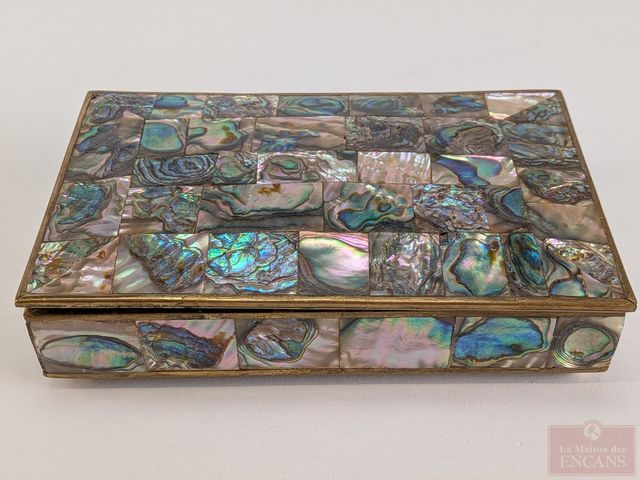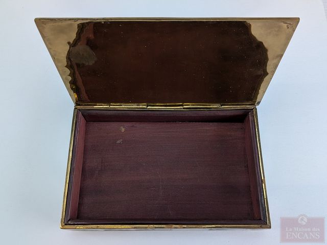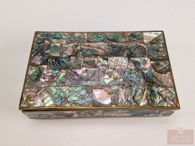 Lot # 114 - Coffret à bijoux en bois, laiton et nacre de perle, mesurant 4x6.4 pouces