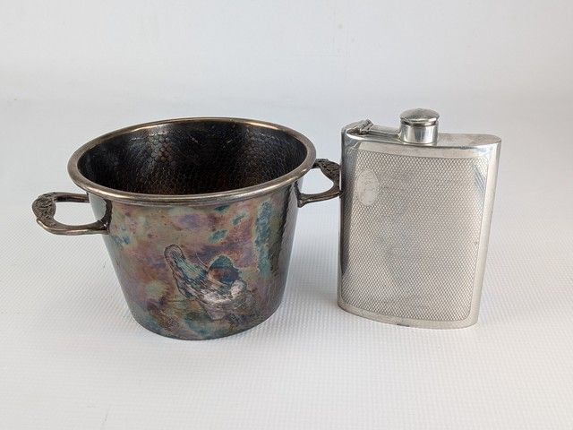 Lot # 11 - Seau à bouteille et flasque vintages, la flasque mesurant 5.5 pouce de hauteur