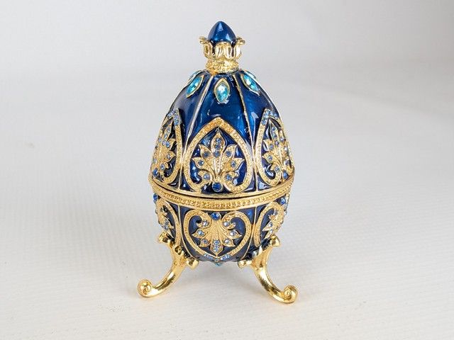 Lot # 106 - Œuf de style Fabergé en métal émaillé avec cristaux, mesurant 4 pouces de hauteur, dans sa boite