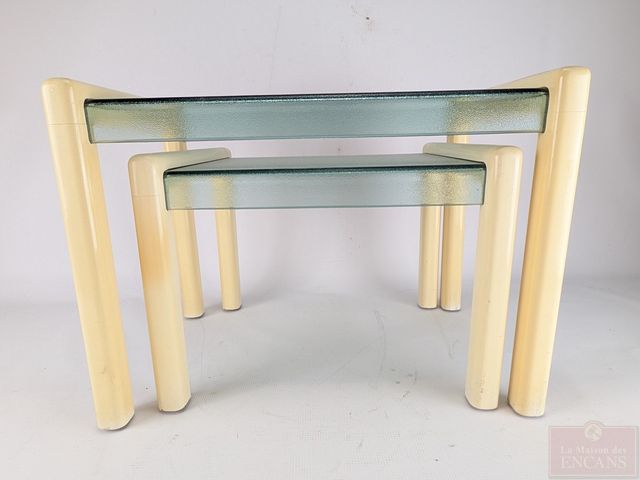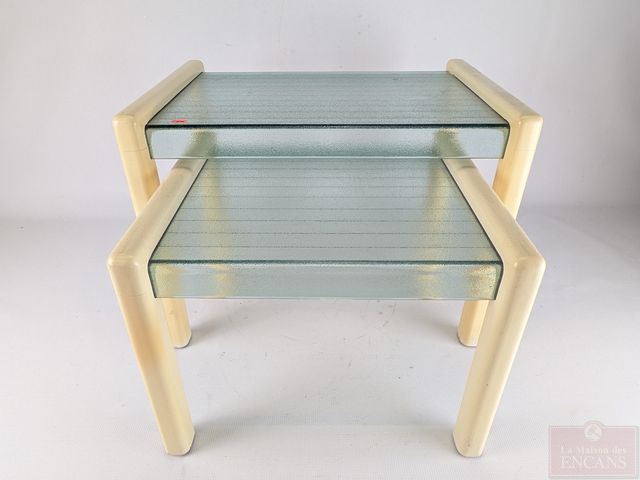 Paire de tables gigognes en bois et verre, la plus grande mesurant 19.5 pouces de largeur
