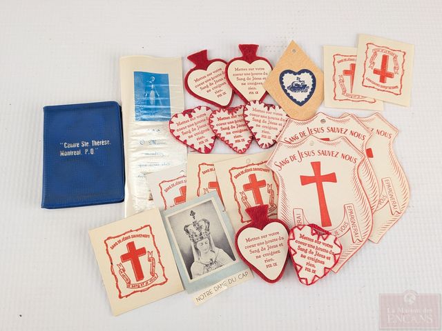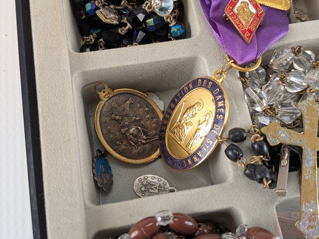 Lot religieux comprenant de nombreux chapelets, ainsi que médailles et documents