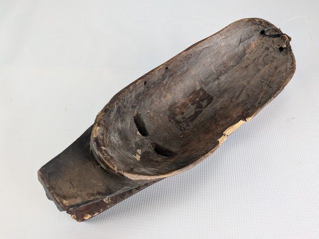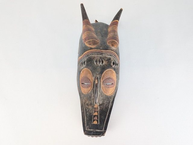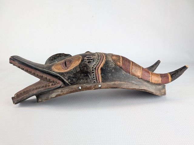 Lot # 14 - Masque africain Zamble Gouro sculpté sur bois et peint à la main, provenant de la Côte-d'Ivoire, représentant une créature composite d'antilope et de crocodile et mesurant 15 pouces de hauteur