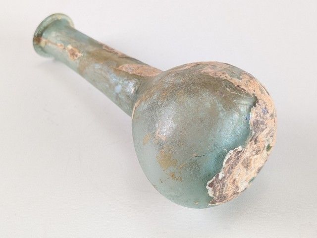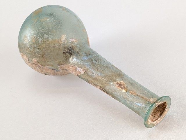 Lot # 98 - Ancienne bouteille romaine lacrimoire de pleureuse en verre soufflé, datant d'approximativement 1 800 ans et mesurant 4.5 pouces