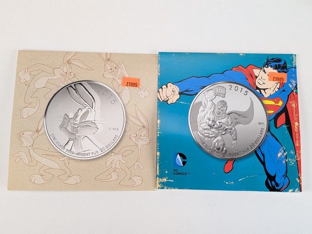 Lot # 72 - Deux pièces canadiennes de vingt dollars 2015 en argent pur 9999 Bugs Bunny et Superman, encapsulées, sans taxes