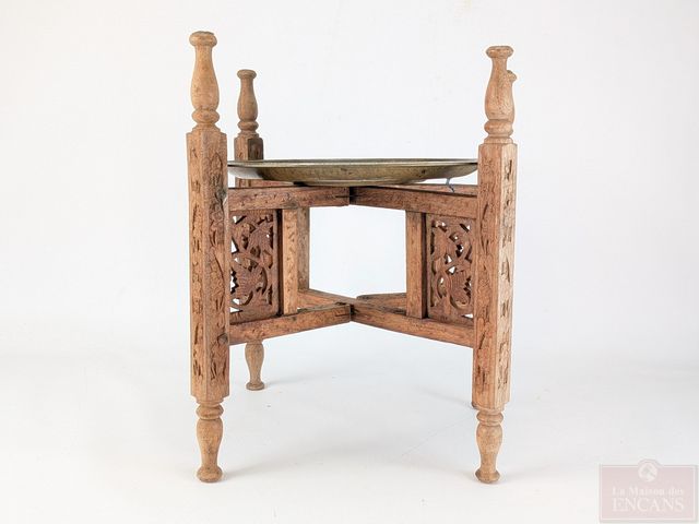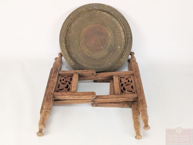 Lot # 136 - Plateau de service tunisien en laiton ciselé avec sa base sculptée sur bois, le plateau mesurant 12.5 pouces de largeur SOLD
