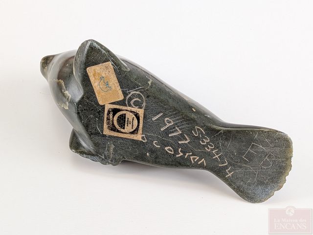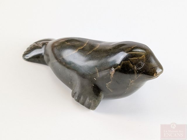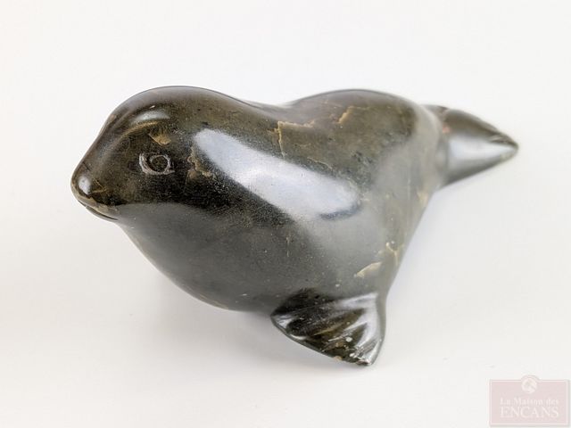 Sculpture inuite sur pierre à savon, signée, datée 1977, représentant un phoque et mesurant 6 pouces de longueur