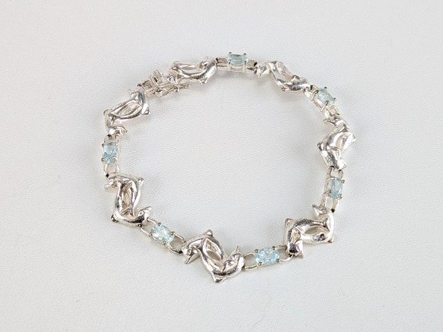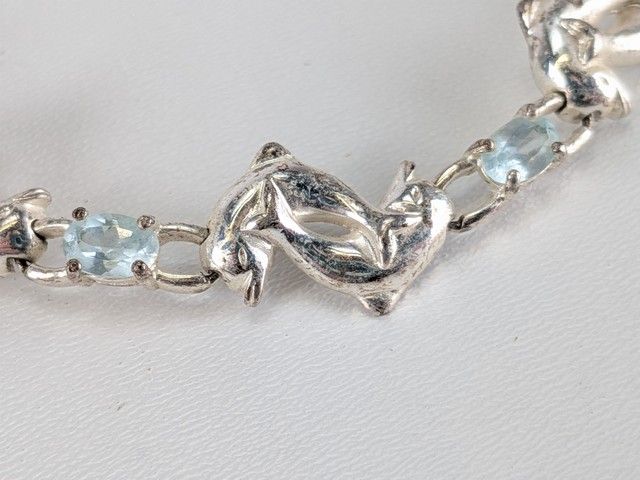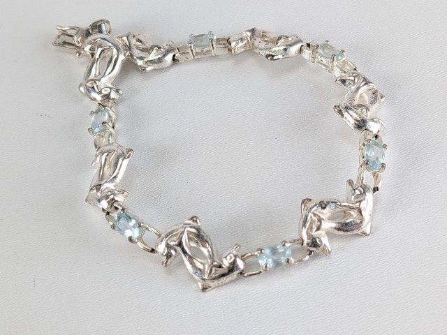 Lot # 71 - Bracelet en argent à motifs de dauphins, serti d'aigue-marine et mesurant 7 pouces de longueur