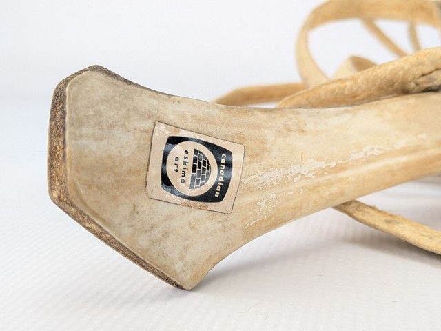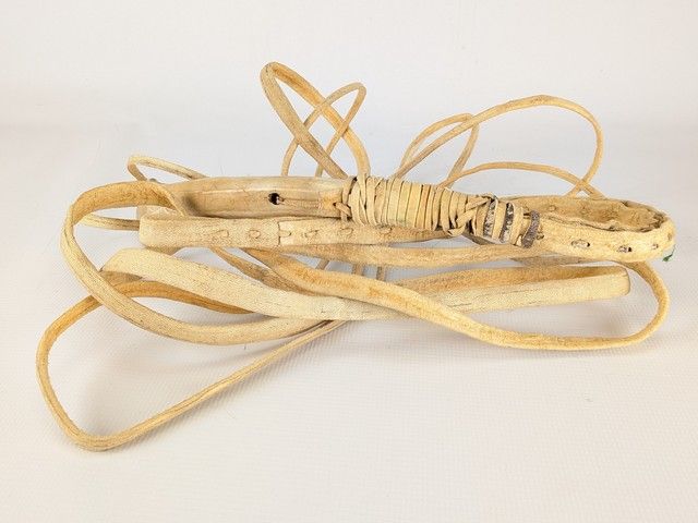 Authentique et exceptionnel fouet inuit (époque esquimaude) fait à la main en corne et cuir de caribou, datant des années 1900, mesurant une rare longueur de 25 pieds et en superbe condition, avec son étiquette 'Canadian Eskimo Art'. Acquis lors de la fermeture d'un musée en Ontario et servant à diriger les attelages de chiens sans contact direct, surtout pour la chasse