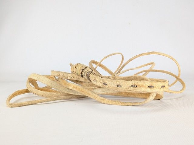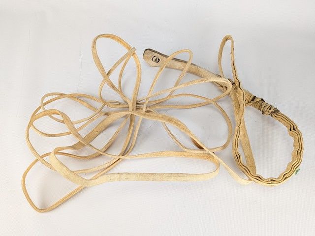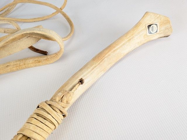 Lot # 31 - Authentique et exceptionnel fouet inuit (époque esquimaude) fait à la main en corne et cuir de caribou, datant des années 1900, mesurant une rare longueur de 25 pieds et en superbe condition, avec son étiquette 'Canadian Eskimo Art'. Acquis lors de la fermeture d'un musée en Ontario et servant à diriger les attelages de chiens sans contact direct, surtout pour la chasse