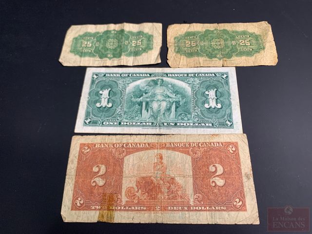 Lot de billets comprenant 2 billets de 25 cents 1923, billet de 1 dollar 1923 et billet de 2 dollars 1923