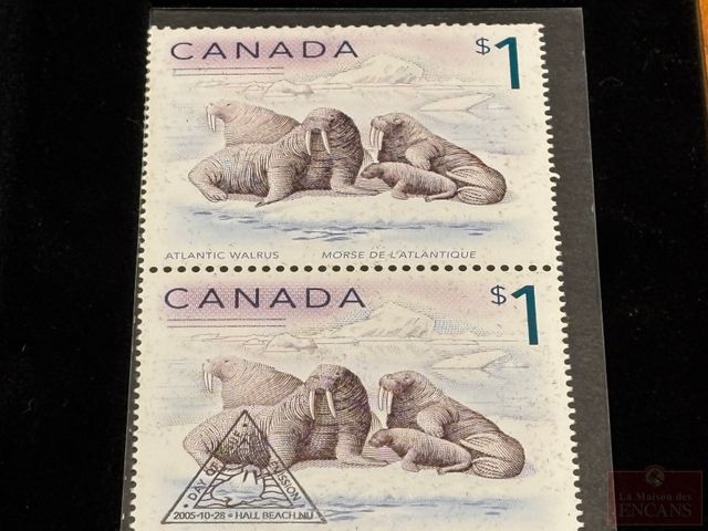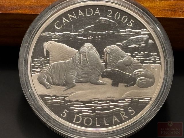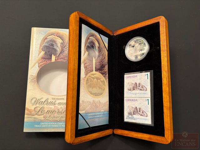 Lot # 124 - Boîtier avec Pièce et Timbres de $5 2005 en Argent pur ‘Le morse et son petit’ PAS DE TAXE