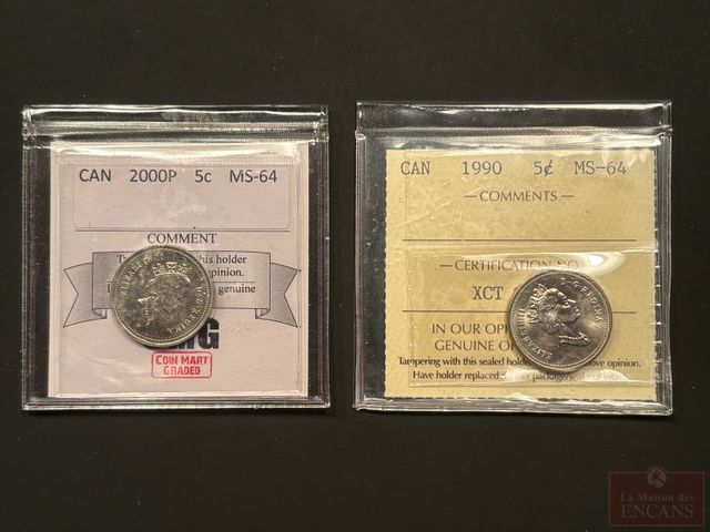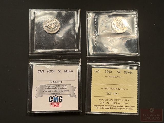 Lot # 66 - 2 Pièces de 5 Cents 1990-2000P (les 2 certifiées ICCS et CMG(2) MS-64