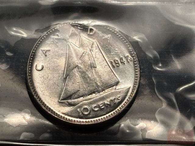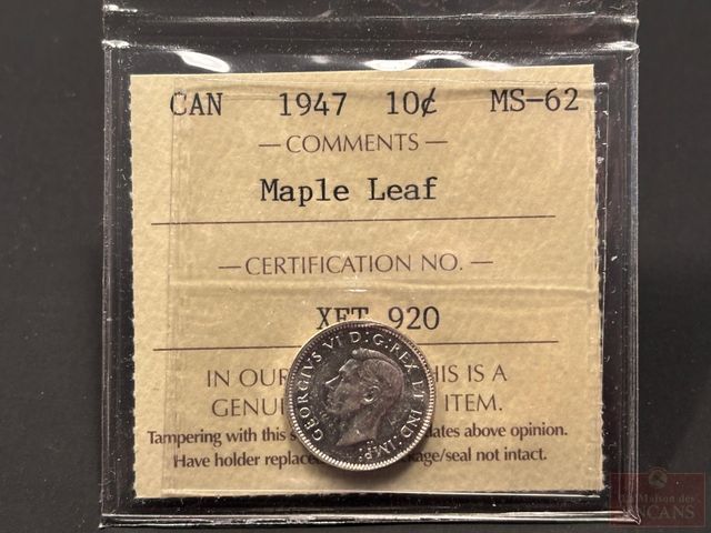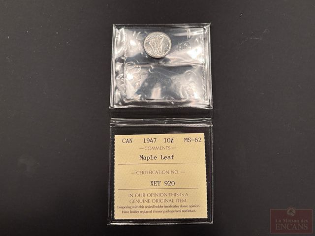 Lot # 24 - Pièce de 10 cents 1947 ‘'Maple Leaf'’ en argent, certifiée ICCS MS-62 (très belle pièce)
