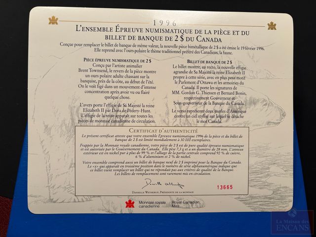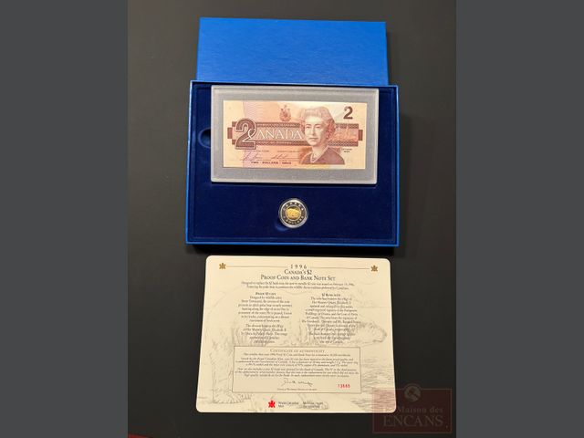 Lot # 140 - Ensemble épreuve numismatique, comprenant pièce et billet de 2 dollars de la Banque du Canada 1996