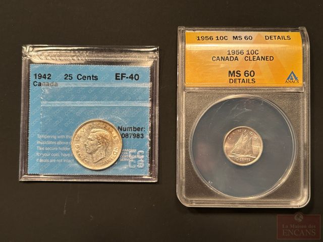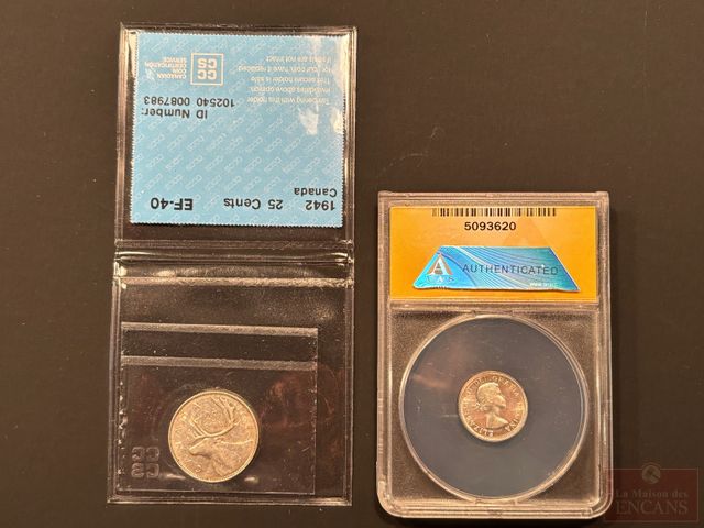Lot # 22 - Pièce en argent de 10 cents 1956, certifiée Anacs MS-60, ainsi que pièce en argent de 5 cents 1942 certifiée ICCS EF-40