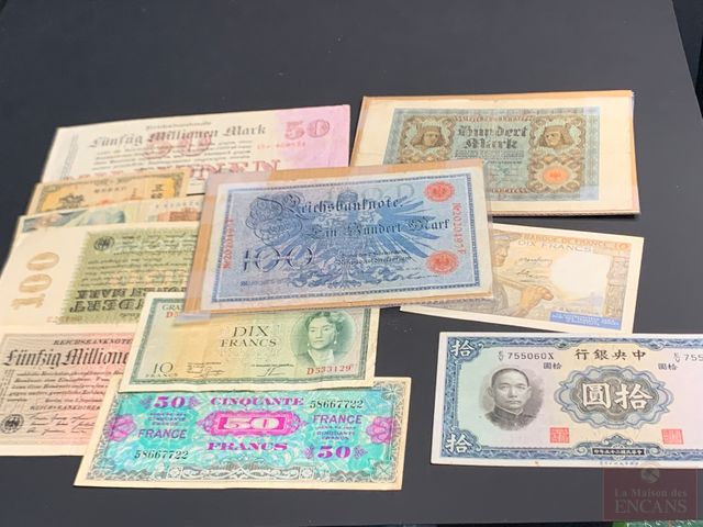 Lot de différent billets du monde. Allemagne, France, Japon etc,