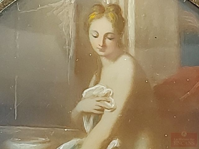 Peinture française miniature, datant du 19eme siècle et mesurant 3 pouces de diamètre, avec cadre mesurant 5x5 pouces