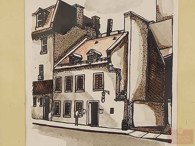 Lot # 153 - Technique mixte sur papier signée, représentant La maison de la Sauvegarde, à Montréal. Située au 160 Notre-Dame Est. et mesurant 7x5 pouces dans son cadre de 18x15.5 pouces VENDU