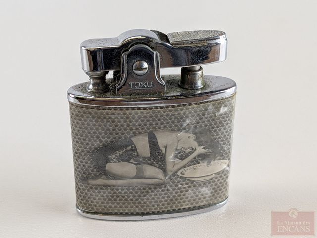 Lot # 202 - Briquet vintage Toxu avec motif de pin-up, mesurant 2 pouces de hauteur SOLD