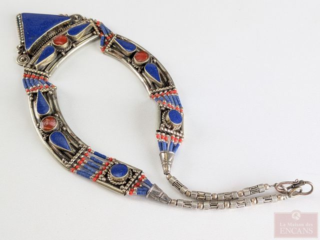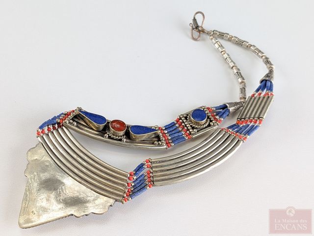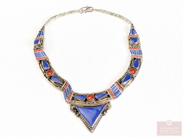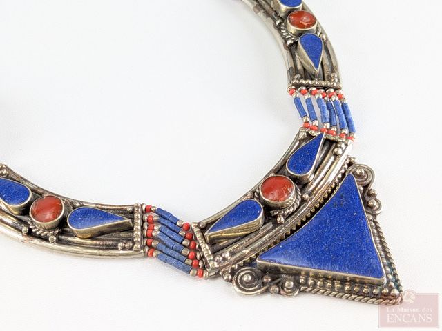 Lot # 240 - Magnifique collier Tibétain vintage avec incrustations en corail rouge et turquoises, mesurant 14 pouces de longueur SOLD