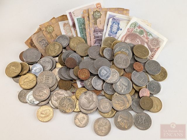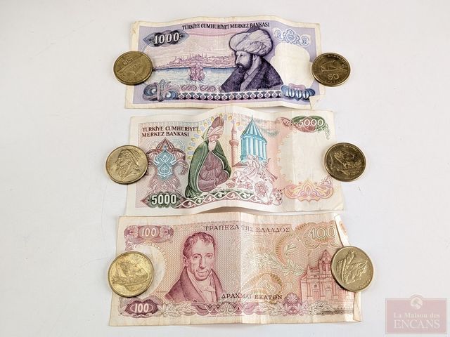 Lot # 124 - Lot numismatique comprenant billet turc de cinq-mille lires, billet turc de mille lires, pièces de monnaie turques, grecques et autres SOLD