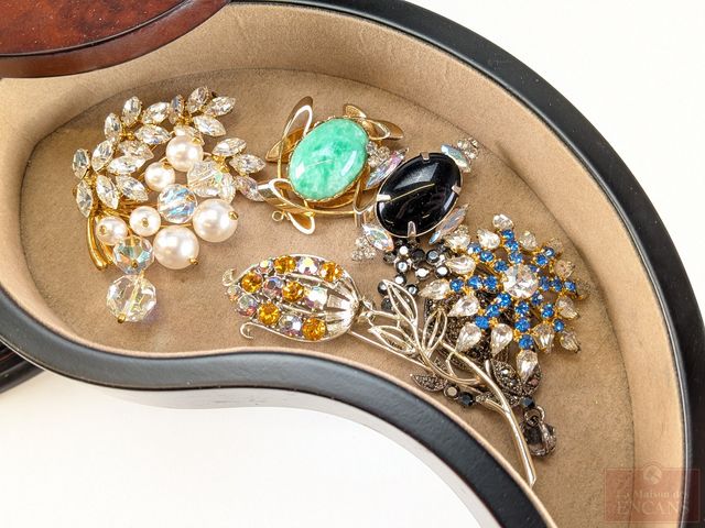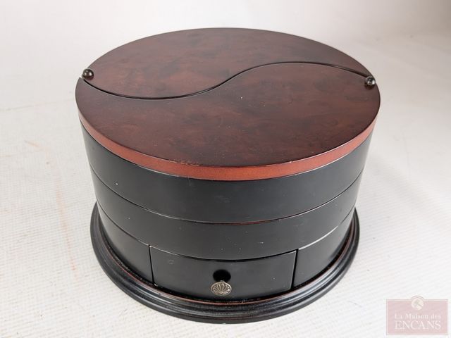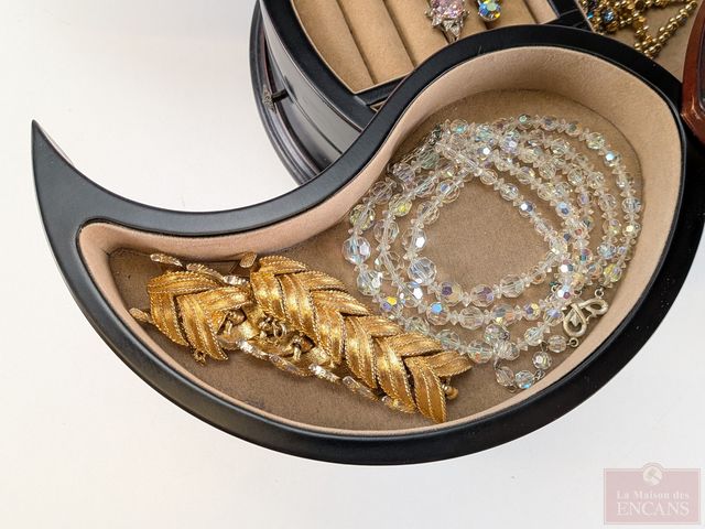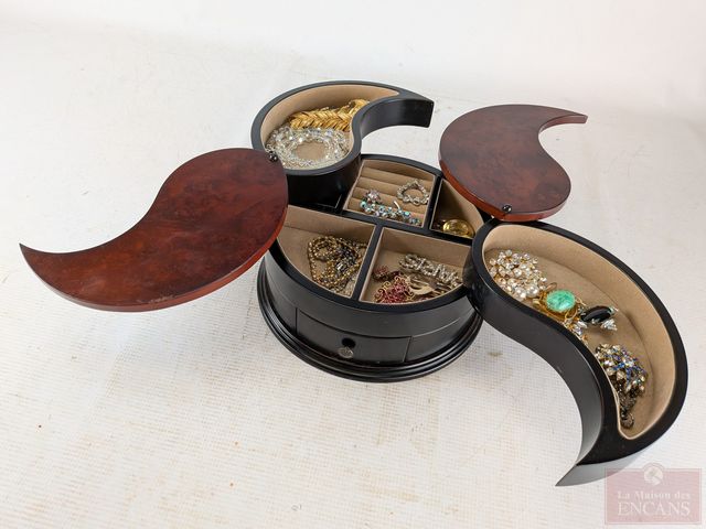 Coffre à bijoux en bois contenant bijoux de fantaisie et mesurant 5 pouces de hauteur
