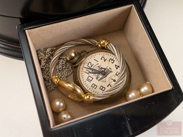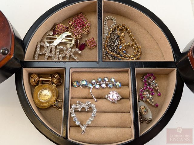 Lot # 136 - Coffre à bijoux en bois contenant bijoux de fantaisie et mesurant 5 pouces de hauteur SOLD