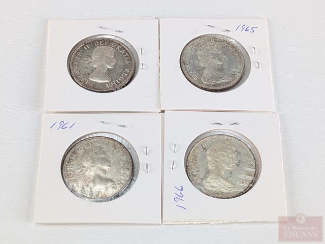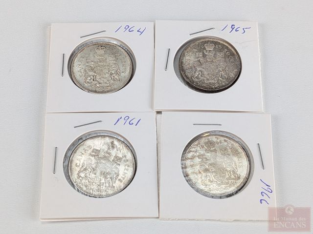 Lot # 197 - Quatre pièces canadiennes de cinquante sous en argent 1961, 1964, 1965 et 1966