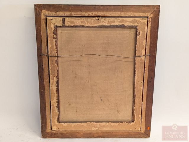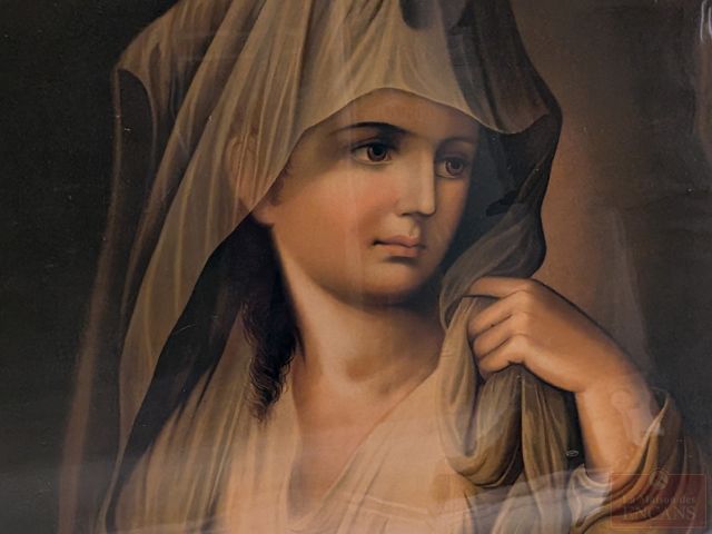 Ancienne chromolithographie sur lin d'une Vierge Sage, d'après la parabole des cinq Vierges Sages et cinq Vierges Folles selon l'évangile de Saint-Matthieu, chapitre 25, versets 1 à 13. On remarque la vierge portant à la main une lampe à l'huile. Ancienne vitre d'origine, large cadre décoratif doré aussi d'origine, sobre, mesurant 24x30 pouces, avec texte du chapitre 25 attaché au tableau