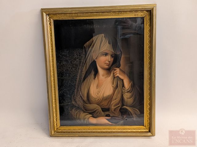 Lot # 129 - Ancienne chromolithographie sur lin d'une Vierge Sage, d'après la parabole des cinq Vierges Sages et cinq Vierges Folles selon l'évangile de Saint-Matthieu, chapitre 25, versets 1 à 13. On remarque la vierge portant à la main une lampe à l'huile. Ancienne vitre d'origine, large cadre décoratif doré aussi d'origine, sobre, mesurant 24x30 pouces, avec texte du chapitre 25 attaché au tableau