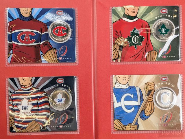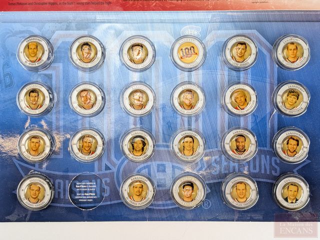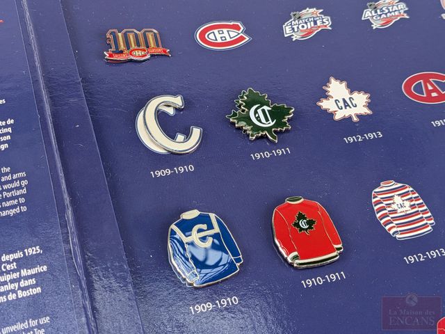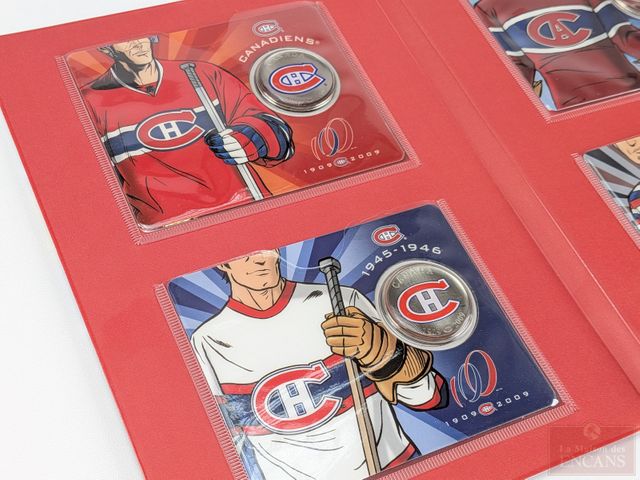 Lot de hockey des Canadiens de Montréal, comprenant épinglettes, jetons et album de collection complet 100 ans d'histoire des Canadien