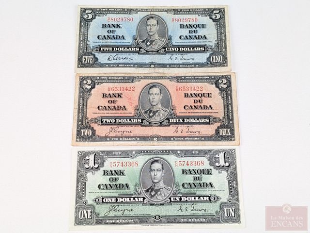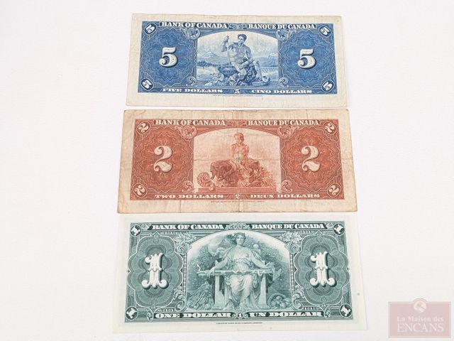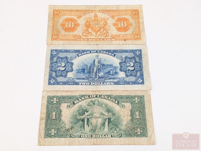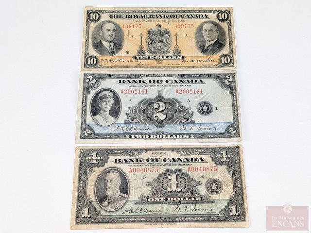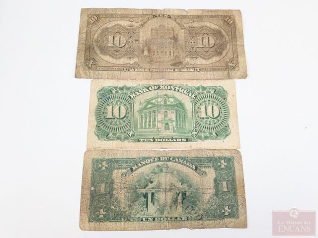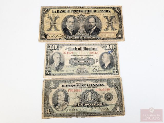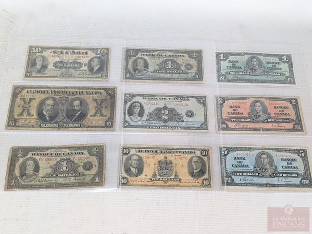 Lot # 201 - Lot d'anciens billets canadiens comprenant un, deux et cinq dollars 1937, deux billets d'un dollar 1935, un, deux et dix dollars 1935, dix dollars de la banque de Montréal 1938 et dix piastres de la banque provinciale du Canada 1919