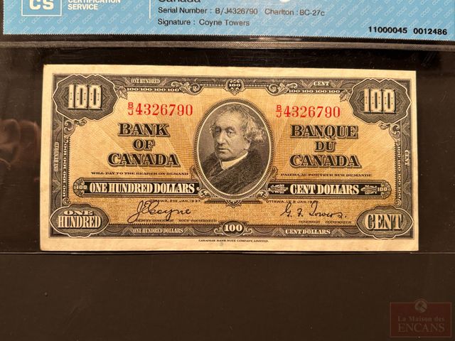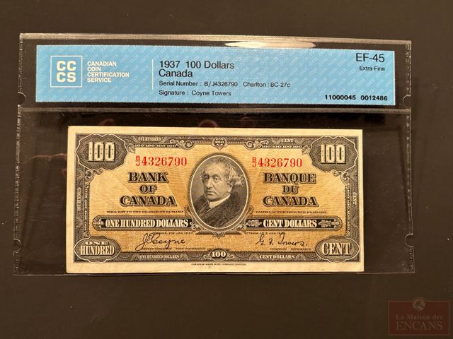 Lot # 85 - Billet de $100 1937 certifié CCCS EF-45 signature Coyne-Towers (en très bonne condition)