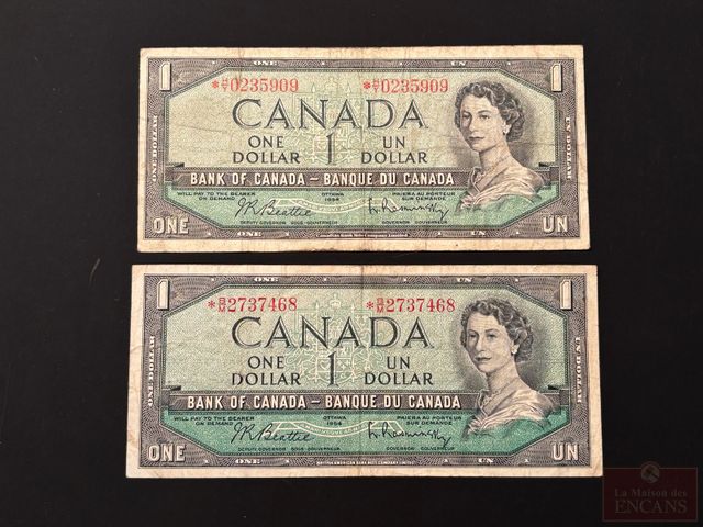 Lot # 9 - 2 Billets de $1 1954 avec astérisque (numéro de remplacement)