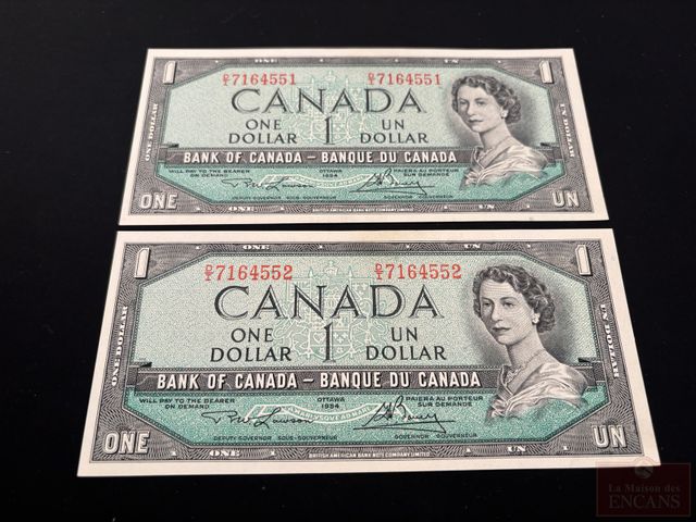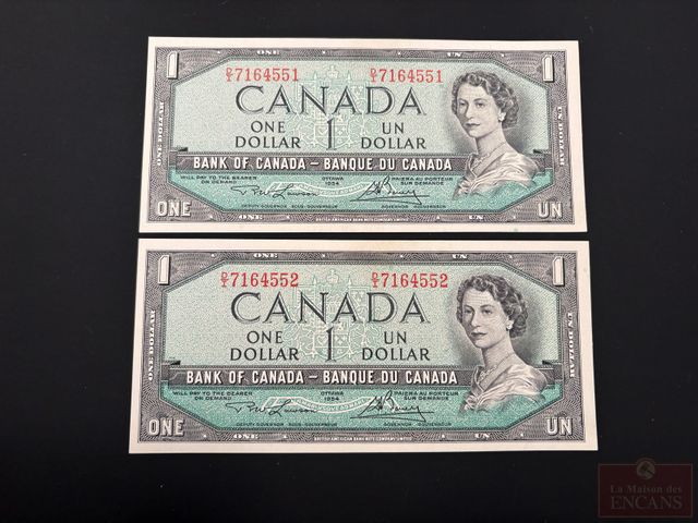 Lot # 184 - 2 Billets de $1 1954 avec numéros consécutifs incirculés/neufs