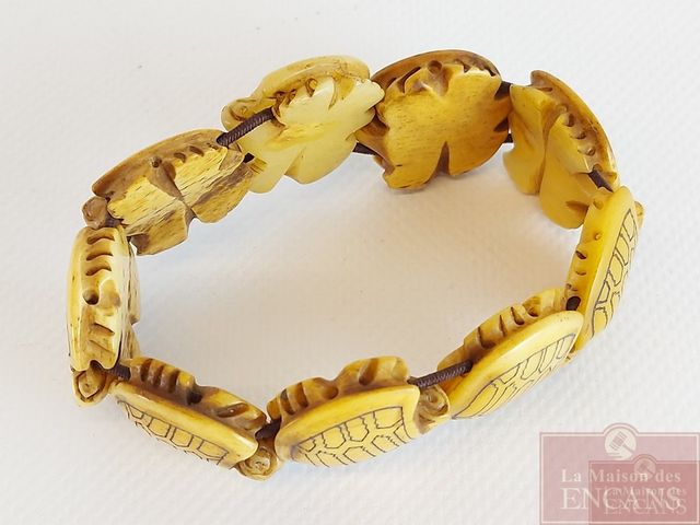 Lot # 61 - Exceptionnel bracelet tibétain constitué de neuf tortues toutes d'environ un pouce et plus chacune et entièrement sculptées à la main sur de l'os - avec une très jolie patine SOLD