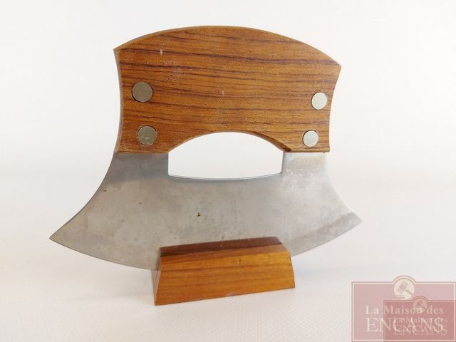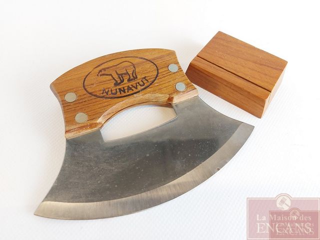 Lot # 58 - Très joli ulu entièrement fait à la main par un artiste inuit avec base et poignée en noyer massif estampillée Nunavut - ainsi que la représentation d'un ours polaire - presque 6 pouces par 4.75 pouces - lame très tranchante VENDU
