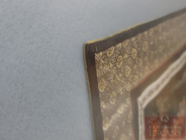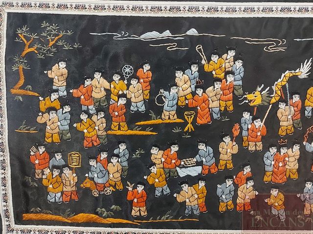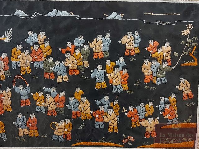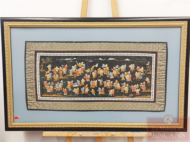 Lot # 175 - Tissus oriental brodée à la main sur pur soie - mesurant 13x26 pouces - très bel encadrement SOLD