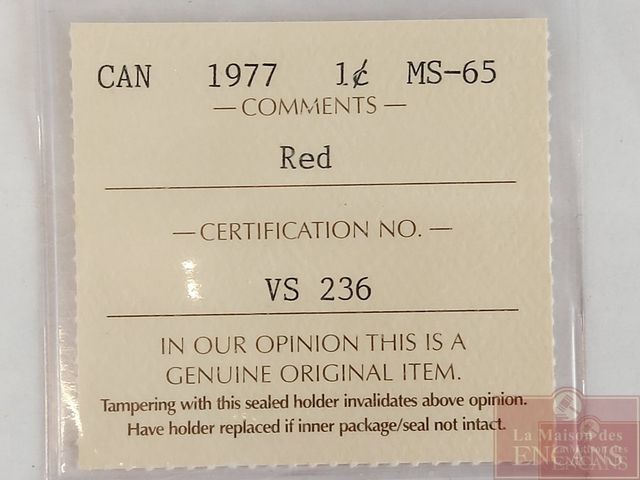 Lot # 47 - Pièce de un sous canadiens de 1977 gradée MS-65 SOLD