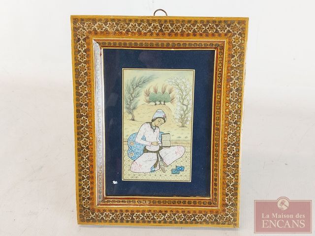 Miniature orientale sur ivoire peinte à la main avec encadrement micro mosaïque - mesurant 9x7 pouces