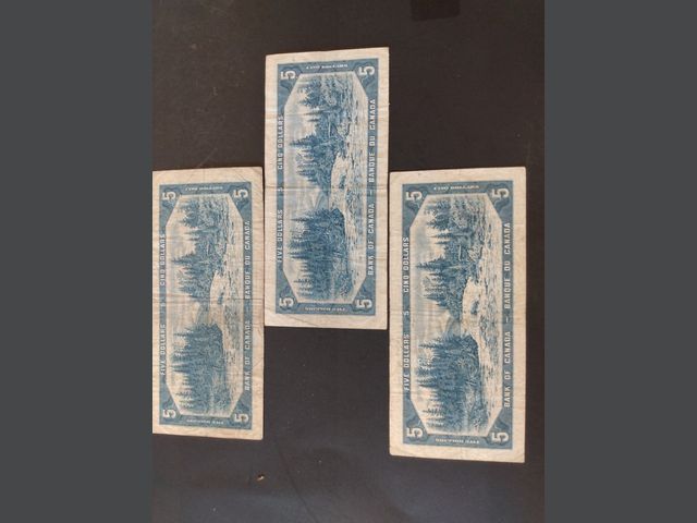 Trois billets de 5 dollars canadiens - 1954 - avec différentes signatures