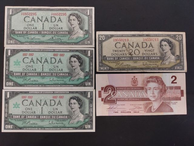 Lot # 229 - Lot de cinq billets canadiens - 3 billets de un dollar de 1954 et 1967 - un billet de 2 dollars de1986 - un billet de 20 dollars de 1954 VENDU