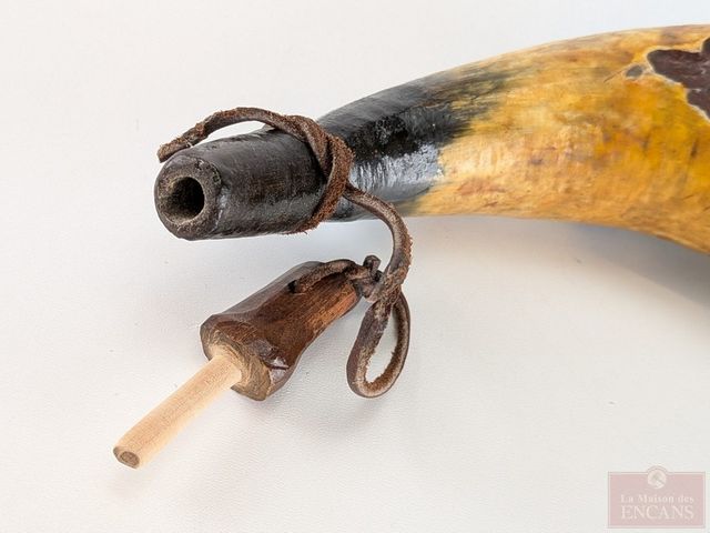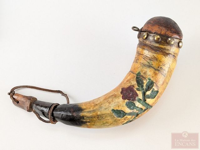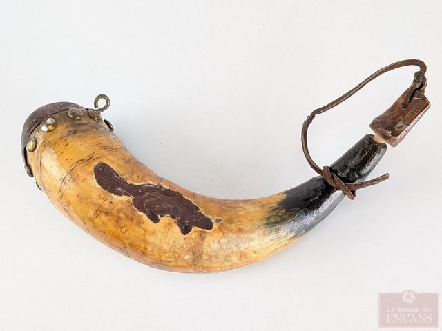 Lot # 233 - Ancienne corne à poudre canadienne sculptée, mesurant 9 pouces de longueur
