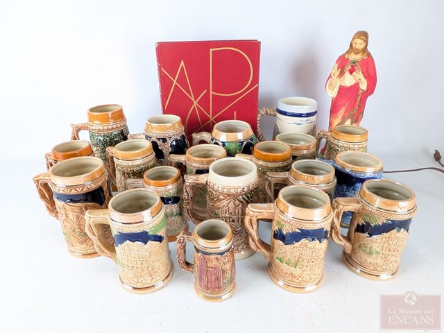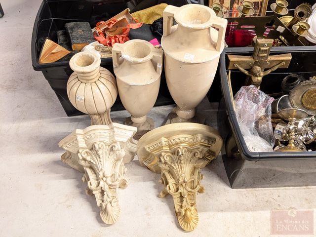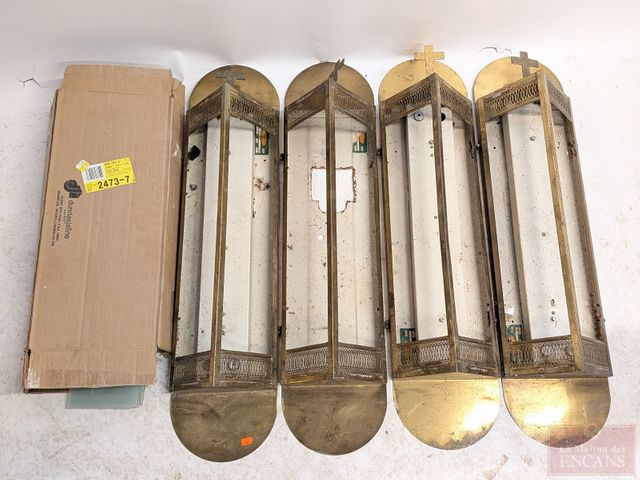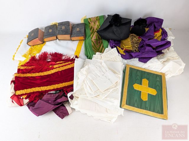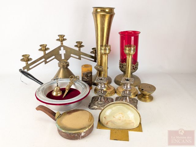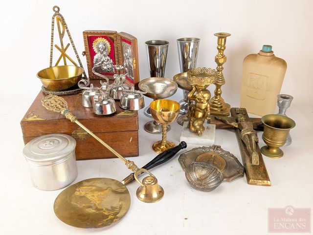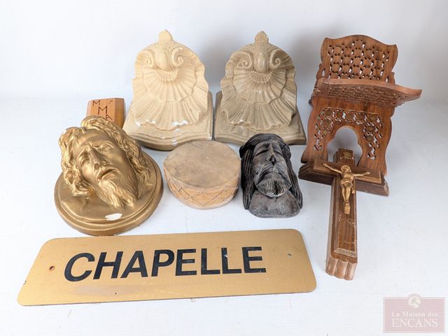 Très gros lot d'articles religieux variés et anciens comprenant sculptures, appliques murales, crucifix, chandeliers, lampes, choppes, et autres. Doit impérativement être récupérée dans les 48h suivant la vente